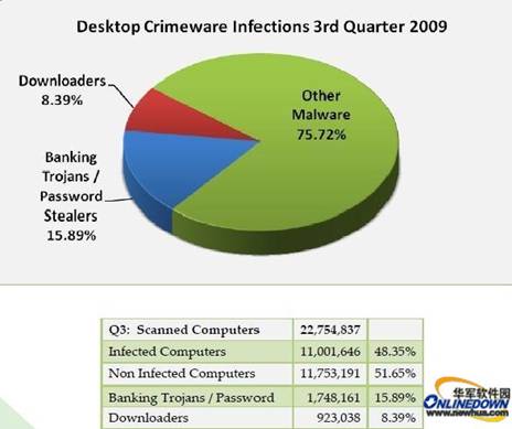 据国外媒体报道,本周,国际反网络钓鱼组织(APWG)2009年第三季度的报告姗姗来迟。从报告中可以看出,在220万台检测电脑中高达48.35%的用户感染了各式各样的恶意软件。