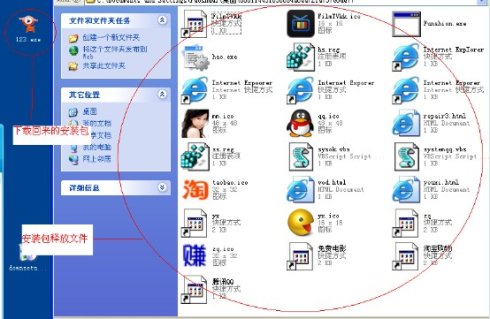 如图,这同样是从该下载站所下载的某网络电视播放软件,在该站同类软件下载数量排行榜中高居第二。左上角的123.exe即是所下载的软件安装包,右边的文件是从该安装包里解压出来的文件,安装包将会把这些文件释放到用户电脑中。经常安装各类软件的网民恐怕已经看出问题的端倪了,这些文件中除去ico图标文件外,有大量的快捷方式,vbs脚本,而正常软件安装包所释放的文件大部分应该是exe和dll文件。