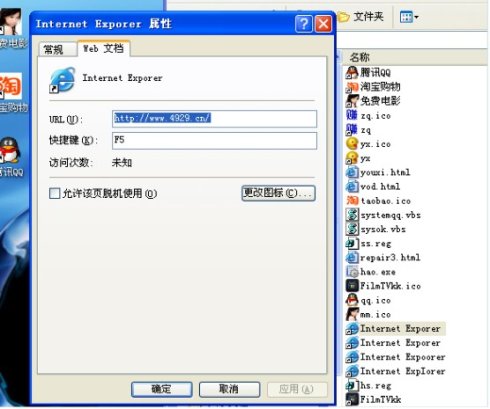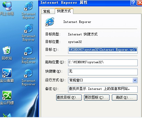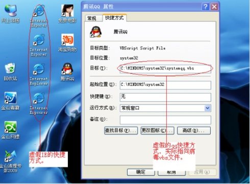 这个“安装包”在桌面上释放上图我们所列出的快捷方式,如上图所示,真正的IE桌面项已经被删除,桌面上4个与IE很相似的快捷项均是“安装包”所释放,与假qq快捷方式类似,这些假IE指向的是system32目录下的URL链接。