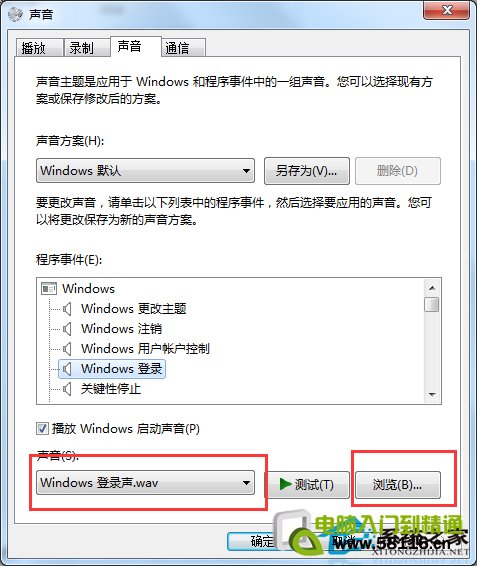 ![]() 二、在打开的“声音”面板上,切换至“声音”选项卡下,选择“Windows登录”。然后再选择“Windows默认”。