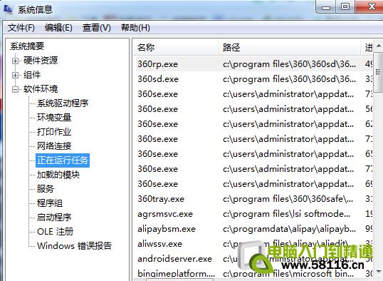 2、随后会弹出一个系统信息窗口,我们依次展开“系统摘要—软件环境—正在运行任务” ,便可以在右边框中看到系统中正在运行的所有程序的信息,包括优先顺序、最小工作集等等