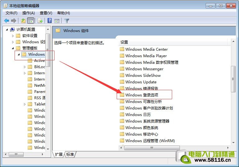 2、在打开页面的左侧,依次打开【计算机配置】→【管理模块】→【windows组件】,在右侧选择【windows登陆选项】,双击打开;