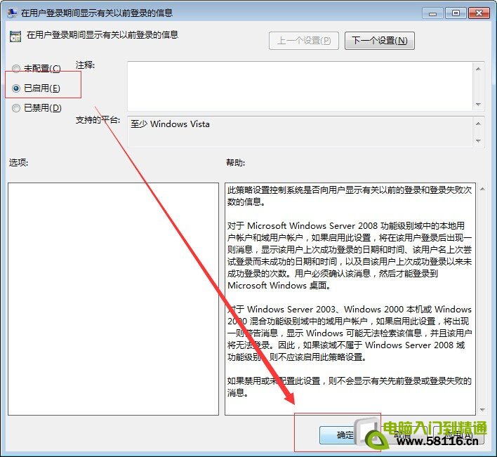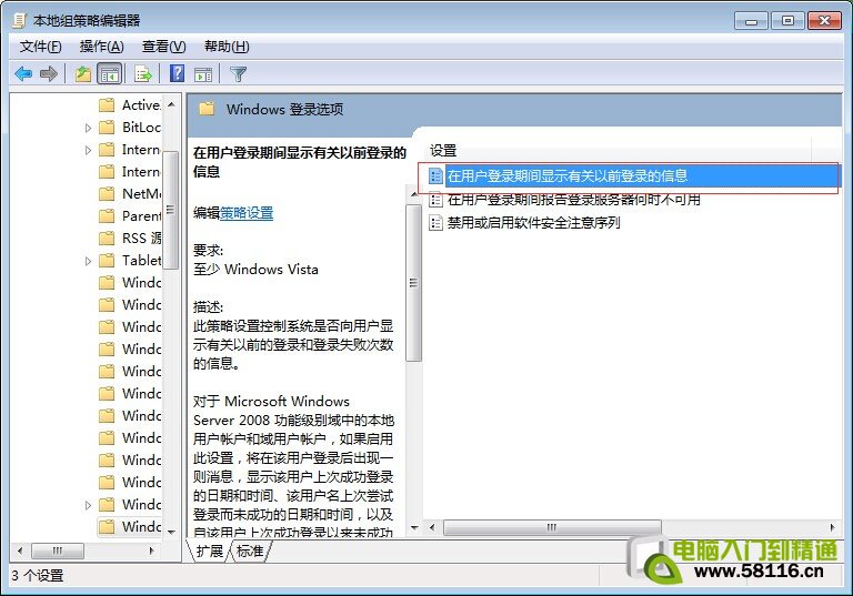 3、在打开页面中,请选择【在用户登陆期间显示有关以前的登陆信息】,使用鼠标左键双击即可;