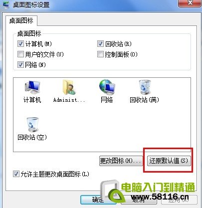 ![]() 方法二:有些朋友使用的是Win7家庭基础版(Home Basic),没有Win7主题更换功能那也不要怕,我们可以进入控制面板,“外观和个性化”,然后点击“更改桌面图标”,点还原默认值就可以了。