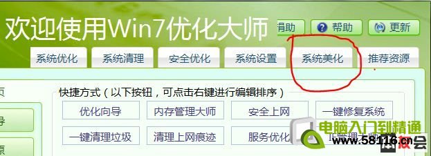 ![]() WIN7优化大师解决方法如下:先下载一个WIN7 优化大师,安装后,启动优化大师,选择“系统美化”选项,如图1,