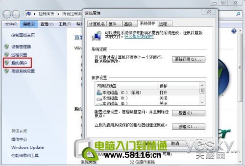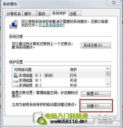 打开系统保护界面 在弹出的“系统保护”选项卡中找到“立刻为启动系统保护的驱动器创建还原点”,然后单击“创建”。