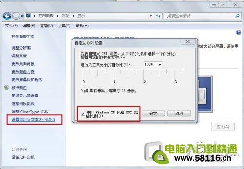 修改默认字体及其格式 另外,由于Win 7的Aero中提供的文字渲染效果,文字的周围会比较模糊,没有XP中棱角分明的感觉,如果你对这一点很在意,也可以通过操作来缓解这个问题。同样是在“显示”窗口中,单击窗口左侧的“设置自定义文本大小” ,在打开的窗口中,勾选“使用Windows XP风格DPI缩放比例”,单击“确定”,就可以完成这一设置。