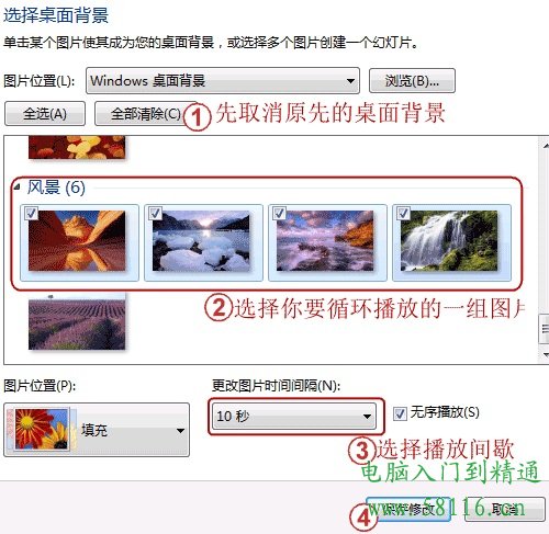 按保存修改就生效了。 图片时间间隔可以按照需要设置。最小的是10秒,你可以设成一分钟变一下,这样像幻灯效果。也有不少网友只是希望每天换一张图片,那可以选中几十张图片每天自动换一张。 如果你用的是笔记本,在时间间隔选项的下面会多出一个选项,可以选择“如果你使用的是电池模式,就暂停幻灯片播放壁纸以节电”。放幻灯要耗电哦。 坏消息,Windows 7 家庭普通版中“桌面墙纸幻灯”这个功能没有。 |