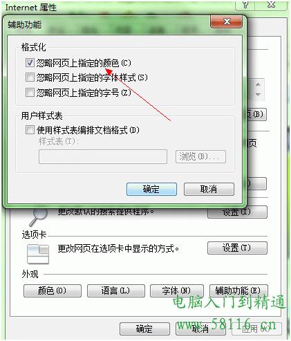 3、网页背景颜色改变: 打开IE,点击工具,点Internet选项,点右下角的辅助功能,然后勾选忽略网页中指定的颜色。注:(这一操作有可能影响网页显示效果,意思就是别的颜色的字现在都是嫩绿色了,不过看起来很养眼,呵呵),然后点确定退出。现在你就会发现屏幕已经变成淡淡的绿色了。这个颜色会比白色柔和许多,刚开始可能你还有些不适应,但确实对我们的眼睛有好处,建议大家试一下。如不太习惯的话可以把勾去掉就是了。