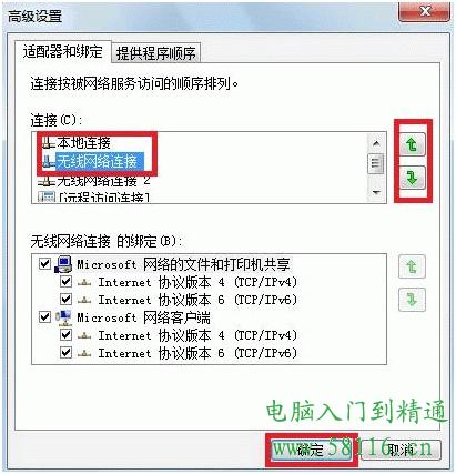 5、在“适配器和绑定”菜单下,选择网络并点击右边的绿色箭头设置优先级,再点击“确定”保存设置。