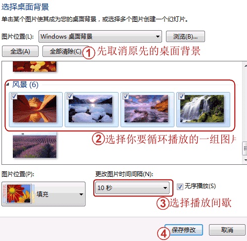 无论你用电脑炒股、网上购物、发邮件,还是办公,都会喜欢漂亮的桌面墙纸。如果你厌倦了一成不变的墙纸,不妨试试 Windows 7 的幻灯墙纸功能。一组图片在桌面上循环播放,放松一下您的心情。 在桌面上右键,选个性化。 ![]() 点桌面背景。 ![]() 你可以按浏览,选择自己喜欢的图片位置。 可以先按全部清除,把原先使用的图片取消。 选择自己要播放的图片。每次点中一张,这张就会被勾上,可以选中多张图片。 在更改图片时间间隔下,可以设置图片多少时间变一下。 ![]() 按保存修改就生效了。 图片时间间隔可以按照需要设置。最小的是 10 秒,你可以设成一分钟变一下,这样像幻灯效果。也有不少网友只是希望每天换一张图片,那可以选中几十张图片每天自动换一张。 如果你用的是笔记本,在时间间隔选项的下面会多出一个选项,可以选择“如果你使用的是电池模式,就暂停幻灯片播放壁纸以节电”。放幻灯要耗电哦。 Windows 7 家庭普通版中“桌面墙纸幻灯”这个功能没有。 |