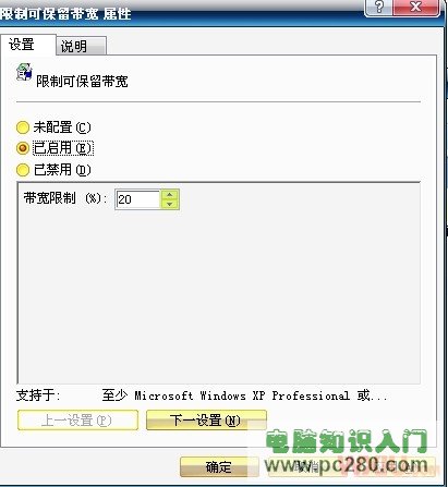 ![]() 第二步:在“计算机配置”项目下,依次点开:管理模板-网络-QoS数据包调度程序;然后在窗口的右侧,找到“限制可保留带宽”一项,用右键点击该项;在弹出的菜单中,点击“属性”,会看到图2所示的“限制可保留带宽属性”窗口。 ![]() 第三步:在“设置”选项卡中我们可以看到:WindowsXP系统默认的“带宽限制”的值是20%。将其改为0或者是5%等较小的数字,点选“已启用”单选钮;然后再点击“确定”按钮即可将新的设置存入计算机中。