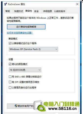 ![]() 3、先把YR改成窗口化运行,如红箭头所示,“目标”编辑框中,在文件路径的末尾添加“ -win”(不含双引号,注意前面有一个空格); ![]() 4、“兼容性”选项卡的设置如图; 步骤:勾选“以兼容模式运行这个程序”,在下面的下拉框中选择“Windows XP(Sevice Pack 2)”,勾选“简化的颜色模式”,在下面的下拉框中选择“16位(65536色)”,最后“确定”。 ![]()