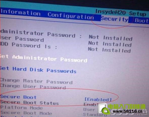 按键盘上下左右键选择各个导航夹,一般在“Security”导航夹内可以找到SecureBoot选项,如下图所示。