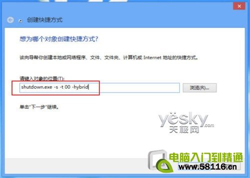 在“创建快捷方式”的对话框中输入命令“shutdown.exe -s -t 00”,按“下一步”。 注意:如果觉得设置之后开关机速度变慢,想要设置为“混合模式”关机,可以增加一个参数“-hybrid”(hybrid中文解释“混合的”,它是控制win8快速关机的关键)。