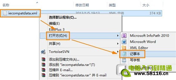 2、在该目录下找iecompatdata.xml文件,在该文件上按下鼠标右键,选择打开方式,以记事本打开。