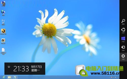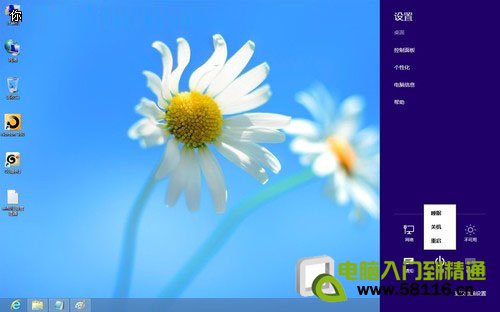 将鼠标移至桌面左上角或右上角,桌面右侧会出现菜单,从中点击“设置”,在设置页面下方会出现一个电源按钮。