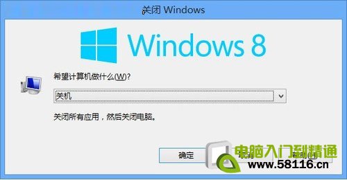 在Windows界面下,同时按“Alt+F4”组合键,可以弹出Win8的关机菜单,点击“确定”即可关机,该方法比较快捷。