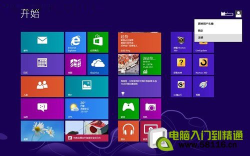 在win8开始屏幕,可以先点击开始屏幕右上角的“用户”选择注销。