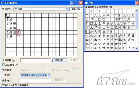 图1|因为有的字用‘按拼音分类的简体中文’是查不到的,使用按偏旁部首分类的表意文字的方法和我们查字典的方法是一样的人人都会,比方说你要找“廼nǎi”这个字它的偏旁是“廴”我们在右侧“分组”窗口中找到三划“廴”点击它,这时左侧的字符映射表中就会出现按笔划分类的所有字体,我们用查字典的方法除去偏旁‘廴’还剩六划,我们就可在六划中找到“廼”(如图02),这时我们用鼠标点击“廼”再点击选择→复制,之后就可以在WPS中进行粘贴了。